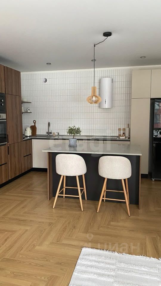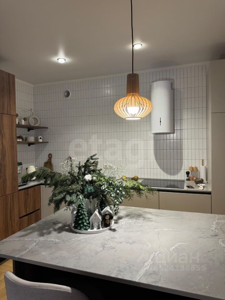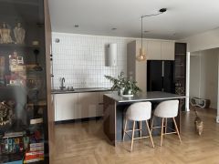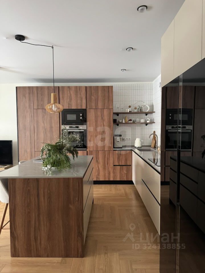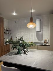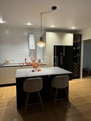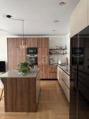 - просторная кухня (30 кв.м., сделан остров, столешница из кварцевого агломерата, большой двухкамерный холодильник, посудомоечная машина, индукционная плита, духовой шкаф и микроволновая печь встроены в пенал, техника Bosch и Maunfeld, установлен кондиционер)