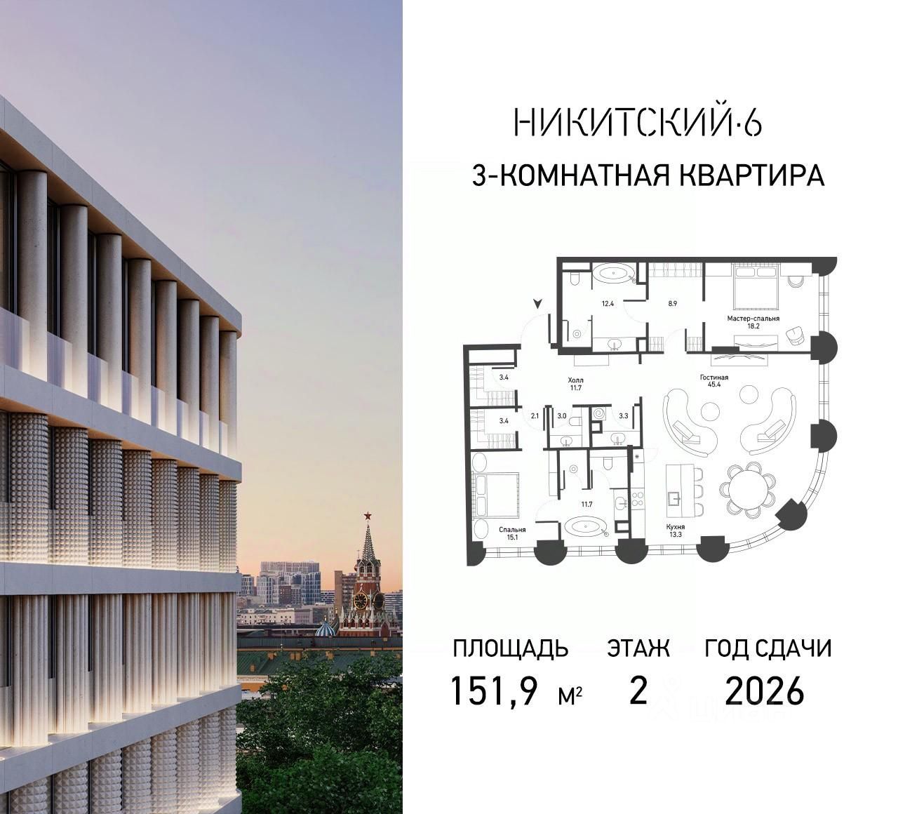 Квартира общей площадью 151,9 кв. м расположена на 2-м этаже жилого дома "Никитский 6". Из окон открывается вид на Никитский бульвар, Арбат, Дом-музей им. Н.В. Гоголя и Центральный Дом журналиста. Планировочное решение включает панорамную кухню-гостиную, 2 мастер-спальни с личными ванными и гардеробными комнатами и сервисные помещения.