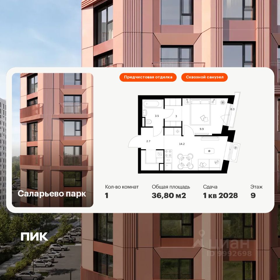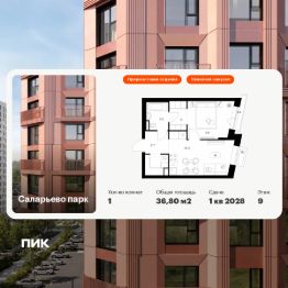 Продаётся 1-комн. квартира площадью 36,8 кв.м на 9 этаже 18 этажного дома (Корпус 74.2, Секция 2) проекта ПИК Саларьево парк. Светлый просторный подъезд на уровне земли, функциональная планировка, большие окна, предчистовая отделка.