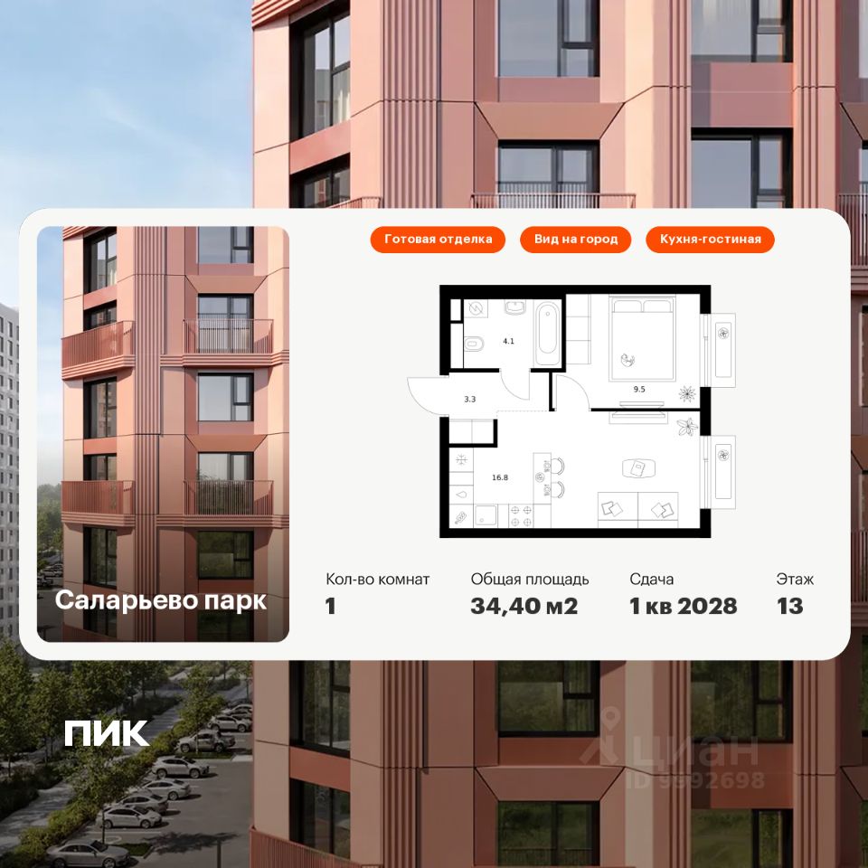 Продаётся 1-комн. квартира площадью 34,4 кв.м на 13 этаже 16 этажного дома (Корпус 74.7, Секция 7) проекта ПИК Саларьево парк. Светлый просторный подъезд на уровне земли, функциональная планировка, большие окна, c отделкой.