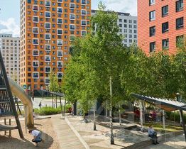 Все корпуса в квартале гармонично сочетаются, образуя единую городскую среду. Между собой их объединяет невысокая этажность и натуральная цветовая гамма. Здесь приятно гулять и проводить время на улице всей семьёй.