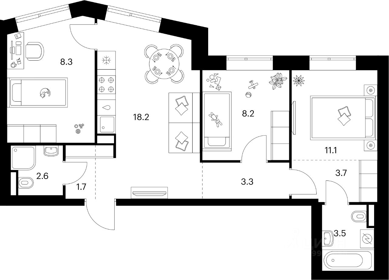 Во дворах-парках жилого квартала есть места для отдыха, детские и спортивные площадки. На первых этажах домов расположены магазины, кафе и полезные сервисы. Также вблизи проекта есть несколько масштабных торговых центров. До ТЦ "Саларис" пять минут пешком, до "Рио", Metro Cash & Carry и "Леруа Мерлен" — пять минут на автомобиле. Артикул 1006591 (Застройщик ООО "Специализированный Застройщик "Тирон")