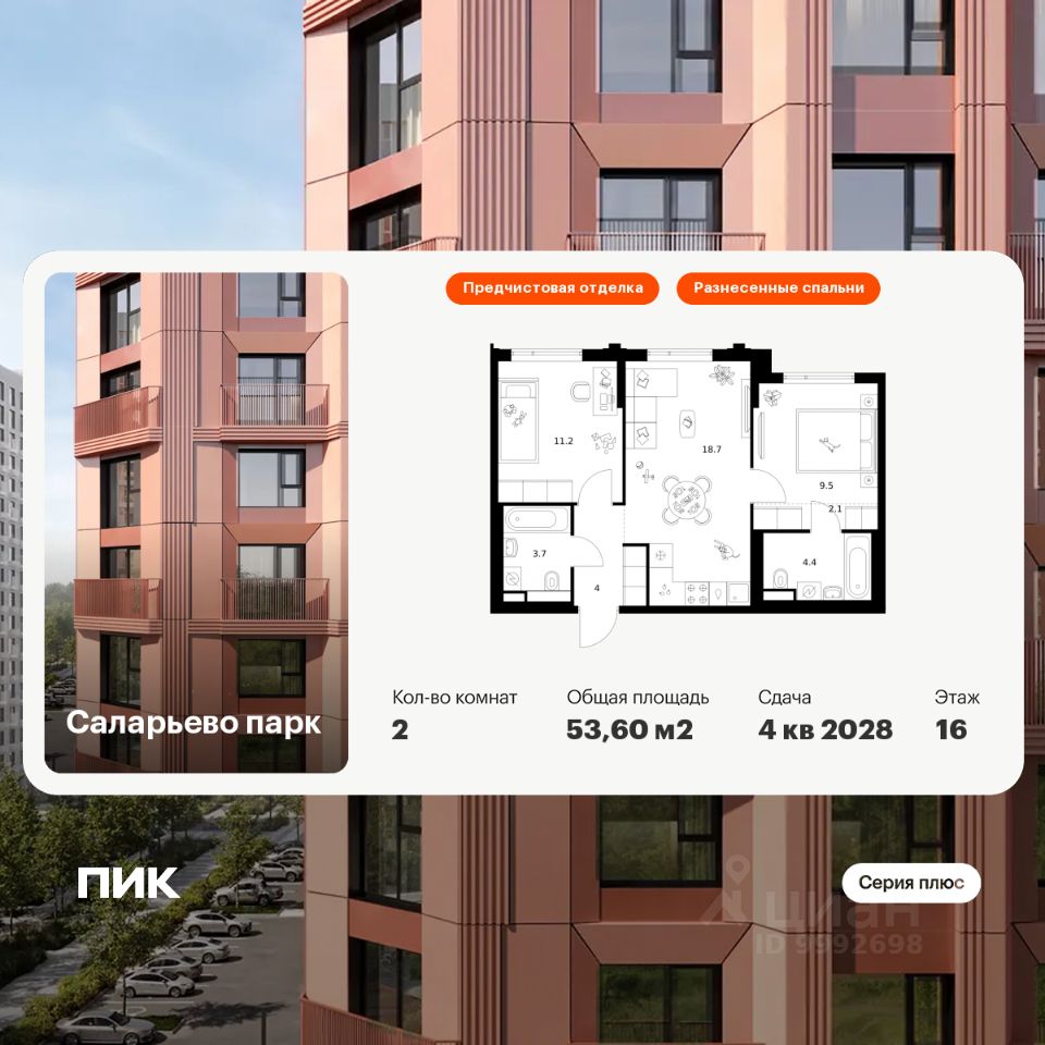Продаётся 2-комн. квартира площадью 53,6 кв.м на 16 этаже 24 этажного дома (Корпус 82.4, Секция 4) проекта ПИК Саларьево парк. Светлый просторный подъезд на уровне земли, функциональная планировка, большие окна, предчистовая отделка.