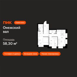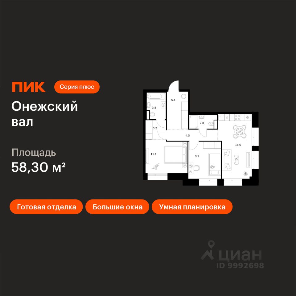 Продаётся 2-комн. квартира площадью 58,3 кв.м на 16 этаже 23 этажного дома (Корпус 1.1.1, Секция 1) проекта ПИК Онежский вал. Светлый просторный подъезд на уровне земли, функциональная планировка, большие окна, c отделкой.