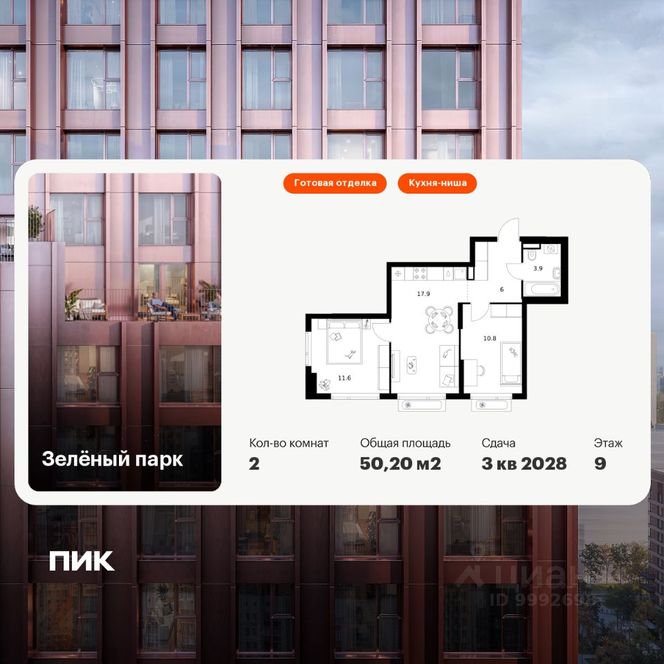 Продаётся 2-комн. квартира площадью 50,2 кв.м на 9 этаже 21 этажного дома (Корпус 5.2, Секция 1) проекта ПИК Зелёный парк. Светлый просторный подъезд на уровне земли, функциональная планировка, большие окна, c отделкой.