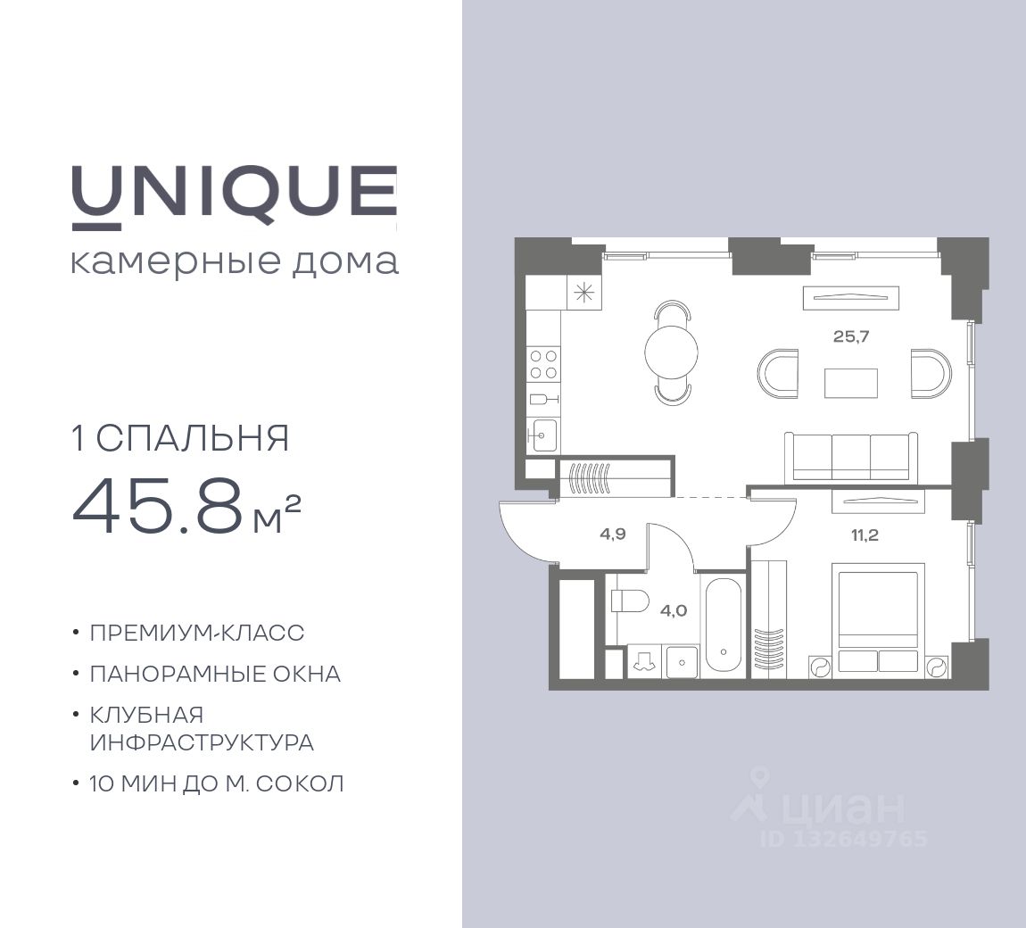 Продается 1-к. квартира номер 329 общей площадью 45.8 кв.м. на 7-м этаже 9 этажного дома, корпус UNIQUE (премиум-класс). Без отделки.