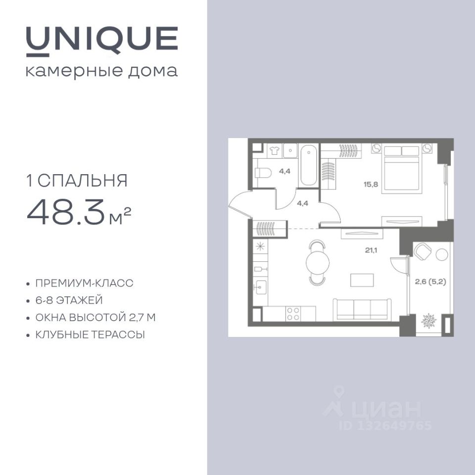 Продается 1-к. квартира номер 39 общей площадью 48.3 кв.м. на 6-м этаже 9 этажного дома, корпус UNIQUE (премиум-класс). Без отделки.