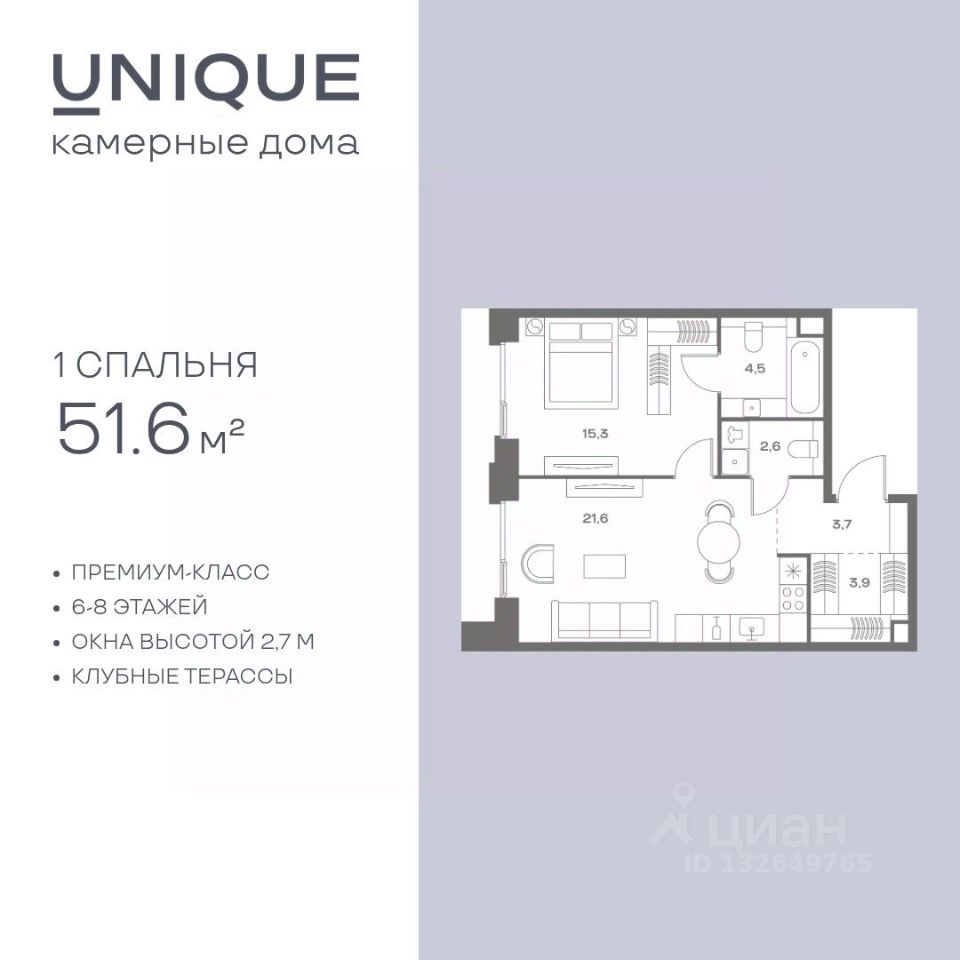 Продается 1-к. квартира номер 40 общей площадью 51.6 кв.м. на 6-м этаже 9 этажного дома, корпус UNIQUE (премиум-класс). Без отделки.