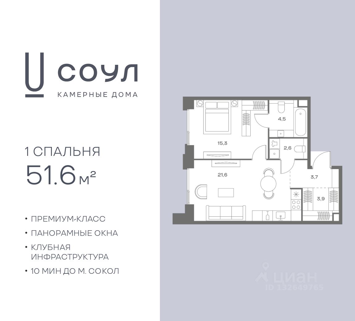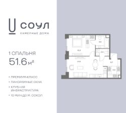 Продается 1-к. квартира номер 40 общей площадью 51.6 кв.м. на 6-м этаже 9 этажного дома, камерные дома СОУЛ (премиум-класс). Без отделки.