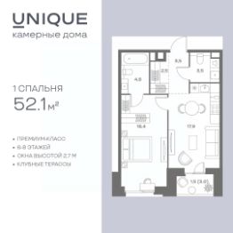 Продается 1-к. квартира номер 119 общей площадью 52.1 кв.м. на 6-м этаже 8 этажного дома, корпус UNIQUE (премиум-класс). Без отделки.