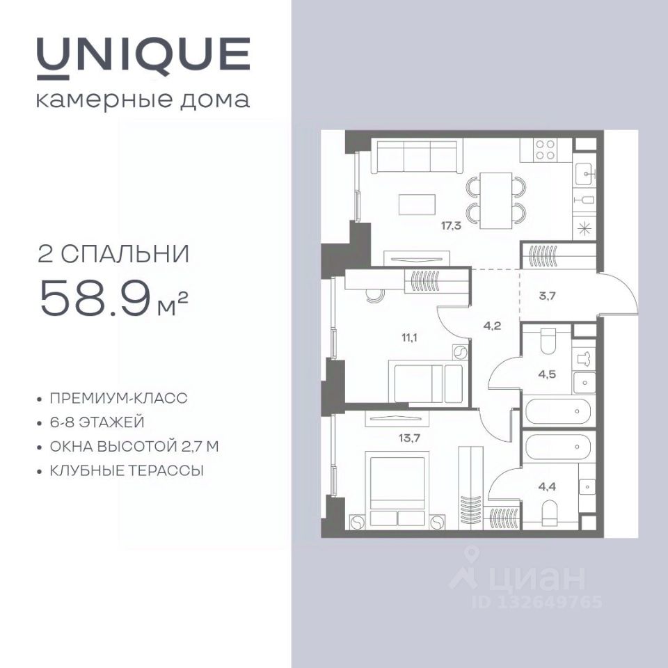 Продается 2-к. квартира номер 317 общей площадью 58.9 кв.м. на 6-м этаже 9 этажного дома, корпус UNIQUE (премиум-класс). Без отделки.