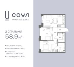 Продается 2-к. квартира номер 317 общей площадью 58.9 кв.м. на 6-м этаже 9 этажного дома, камерные дома СОУЛ (премиум-класс). Без отделки.