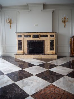 - гостиная-столовая с прямой панорамой (7.5 м - наибольшая в ЖК) и мраморным камином - 40 м²;
