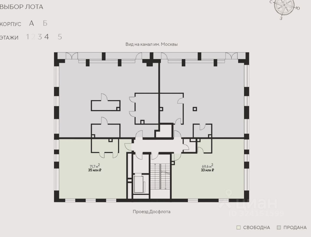 Предлагается квартира в новостройке бизнес-класса. Или на сайте досфлота10. Пятиэтажное здание, на каждом этаже расположено четыре квартиры. Общая площадь предлагаемой квартиры составляет 69.6 квадратных метра. Квартира расположена на 4 этаже и предлагается со свободной планировкой и без отделки. Высота потолков в квартире 4 метра, высота дверных проемов составляет 2,4 метра. В здании установлен скоростной лифт KONE, кабина которого также имеет высоту 2,4 метра. Квартира включает в себя два санузла, высокие окна (3 метра), выходящие на две стороны. Установлены алюминиевые рамы ALUTECH и стеклопакеты Guardian.