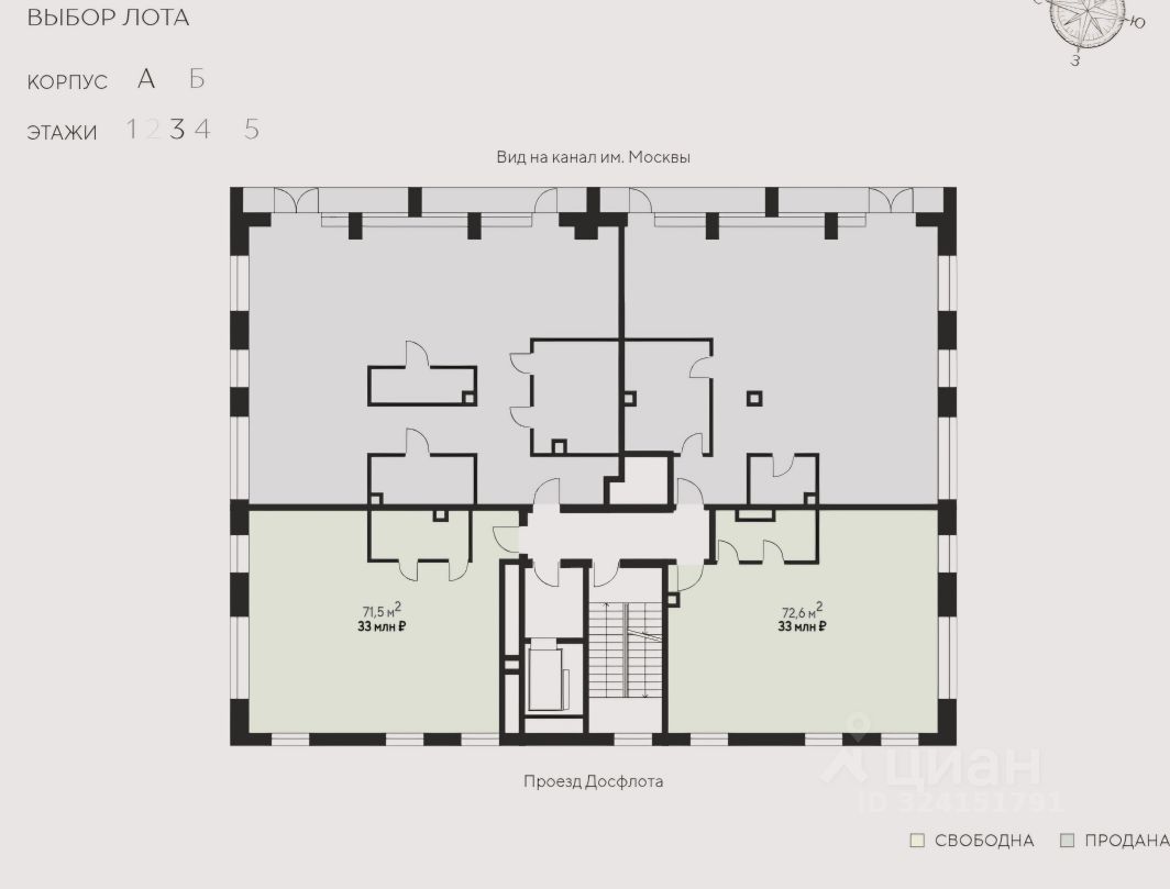 Предлагается квартира в новостройке бизнес-класса. Или на сайте досфлота10. Пятиэтажное здание, на каждом этаже расположено четыре квартиры. Общая площадь предлагаемой квартиры составляет 72.6 квадратных метра. Квартира расположена на 3 этаже и предлагается со свободной планировкой и без отделки. Высота потолков в квартире 4 метра, высота дверных проемов составляет 2,4 метра. В здании установлен скоростной лифт KONE, кабина которого также имеет высоту 2,4 метра. Квартира включает в себя два санузла, высокие окна (3 метра), выходящие на две стороны. Установлены алюминиевые рамы ALUTECH и стеклопакеты Guardian.