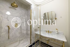 Детально воссозданный исторический интерьер эпохи модерна: штучный паркет, лепнина, высокие распашные двери, метлахская плитка, сантехника Devon&Devon, светильники Ralf Lauren.