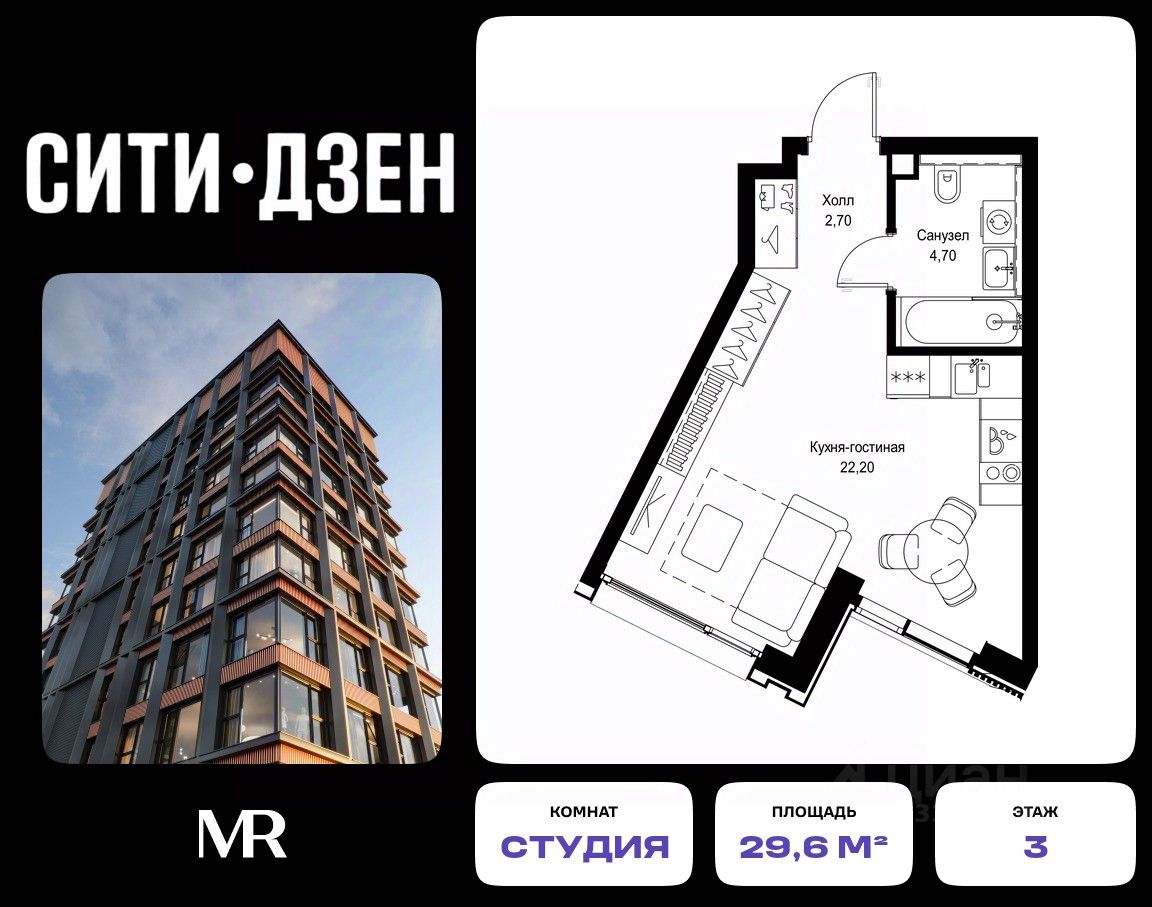 Продается студия от застройщика в жилом мультиквартале СИТИДЗЕН на 3-м этаже в корпусе #1 урбан-блока PARUS. Общая площадь лота составляет 29.60 м²