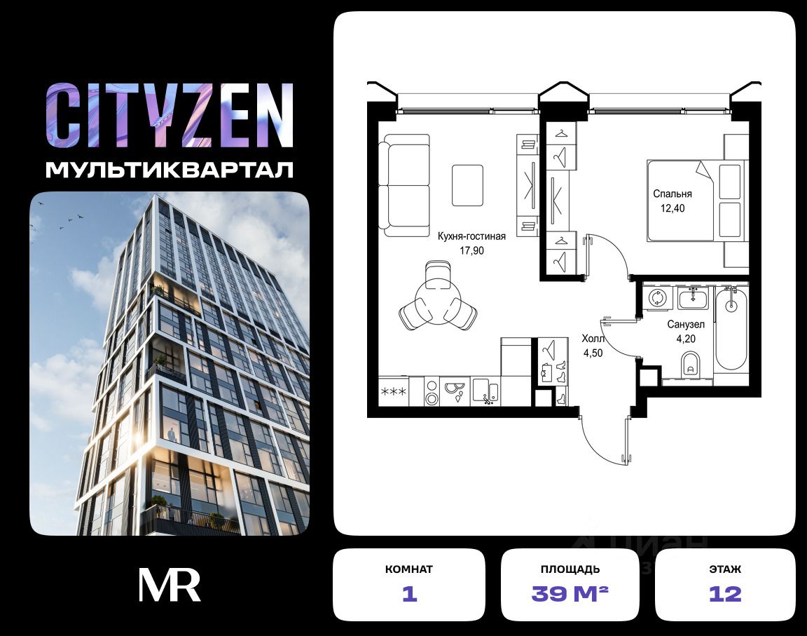 Продается 1-комнатная квартира от застройщика в жилом мультиквартале CITYZEN на 12-м этаже в корпусе #5 урбан-блока PARUS. Общая площадь лота составляет 39 м²
