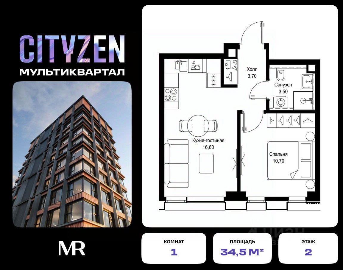 Продается 1-комнатная квартира от застройщика в жилом мультиквартале CITYZEN на 2-м этаже в корпусе #2 урбан-блока PARUS. Общая площадь лота составляет 34.50 м²