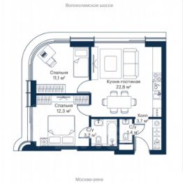 Общая площадь 54.7 м2 . Кухня гостиная 23 м2. Две изолированные комнаты: одна 11,5 м2, другая мастер-спальня 12,5 м2 со своим отдельным санузлом. Панорамные окна с видом во двор , на область и частично на реку.