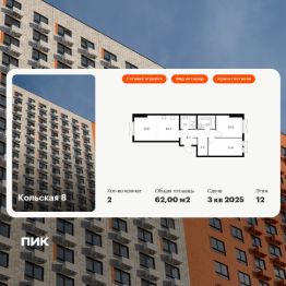 Продаётся 2-комн. квартира площадью 62 кв.м на 12 этаже 25 этажного дома (Корпус 2.1, Секция 2) проекта ПИК Кольская 8. Светлый просторный подъезд на уровне земли, функциональная планировка, большие окна, c отделкой.