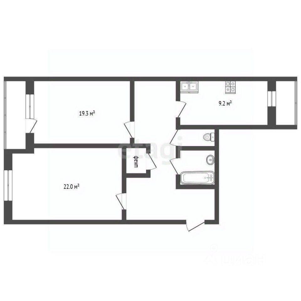 Кухня 9,2 кв.м, комната 1 19,3 кв.м, комната 2 22 кв.м.