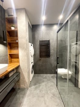 Один санузел с ванной, где также поставлен бойлер, второй с душевой кабиной - слив воды в пол! Стиральная машинка и сушильная машинка Miele.