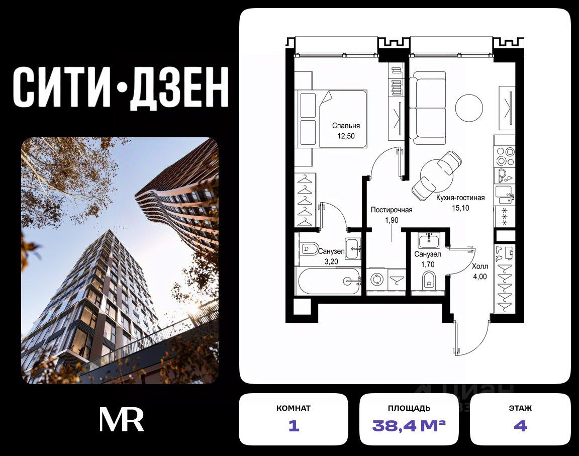 Продается 1-комнатная квартира от застройщика в жилом мультиквартале СИТИДЗЕН на 4-м этаже в корпусе #8. Общая площадь лота составляет 38.40 м²