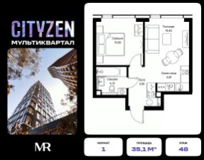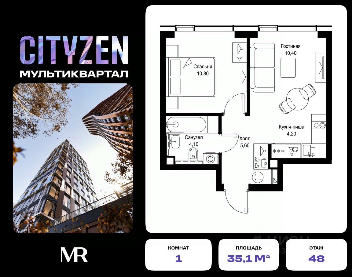 Продается 1-комнатная квартира от застройщика в жилом мультиквартале CITYZEN на 48-м этаже в корпусе #6 урбан-блока VOLNA. Общая площадь лота составляет 35.10 м²