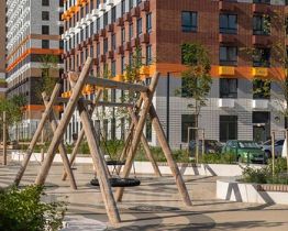 На первых этажах разместятся магазины и различные сервисы услуг. В зелёных дворах без автомобилей будут обустроены детские площадки и места для отдыха.