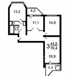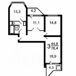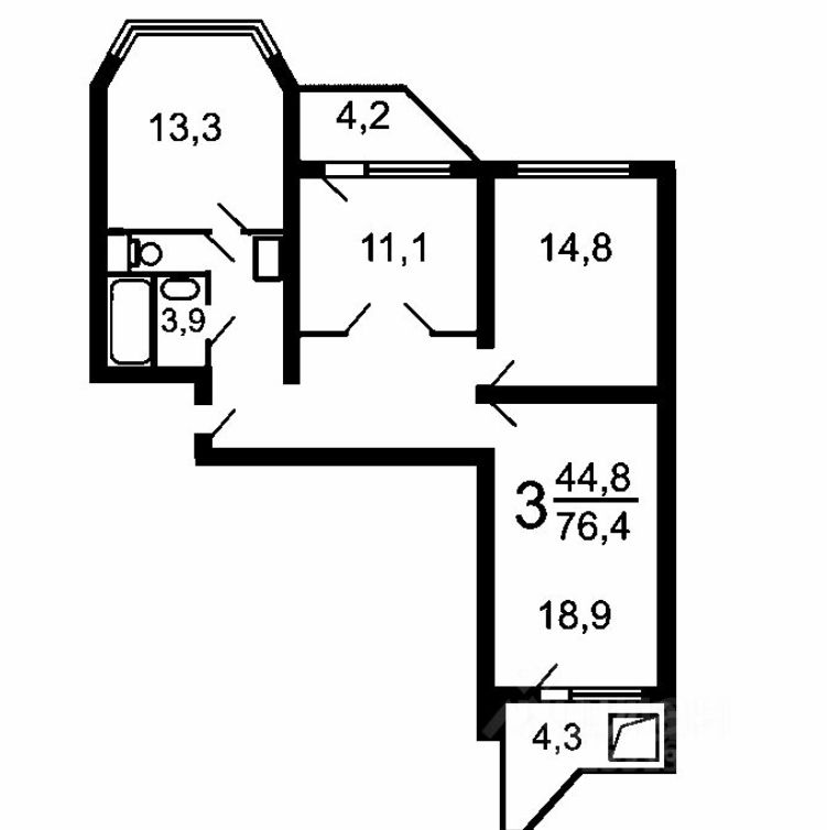 Общая площадь квартиры 76 кв. м, кухня 14 кв. м, две лоджии по 5 и 4 кв. м, комнаты 19, 15 и 11 кв. м.