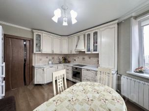 В квартире остается кухонный гарнитур и спальный гарнитур, встроенные шкафы в прихожей, вся мебель хорошего качества и в единой стилистике.