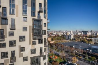 Свои детские и спорт площадки на территории. Фасад с отделкой из натуральных материалов, просторные холлы входных групп и продуманный формат апартаментов.