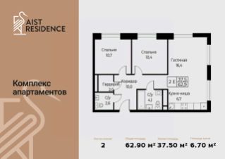Продаются 3-к апартаменты площадью 62.90 кв.м. на 21-м этаже