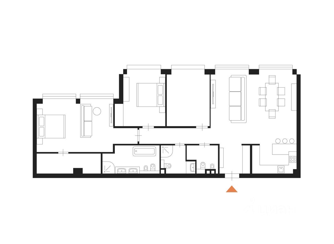 Планировочное решение: кухня-гостиная-столовая, мастер-спальня с гардеробной и ванной комнатами, 2 спальни, ванная комната, гостевой с/у. В квартире предусмотрено множество встроенных шкафов и систем хранения.