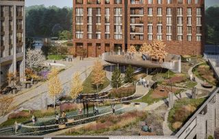 Двор: единый неразрывный двор с пешеходным мостом, дзенсадом, природными амфитеатрами, детскими и спортивными зонами.