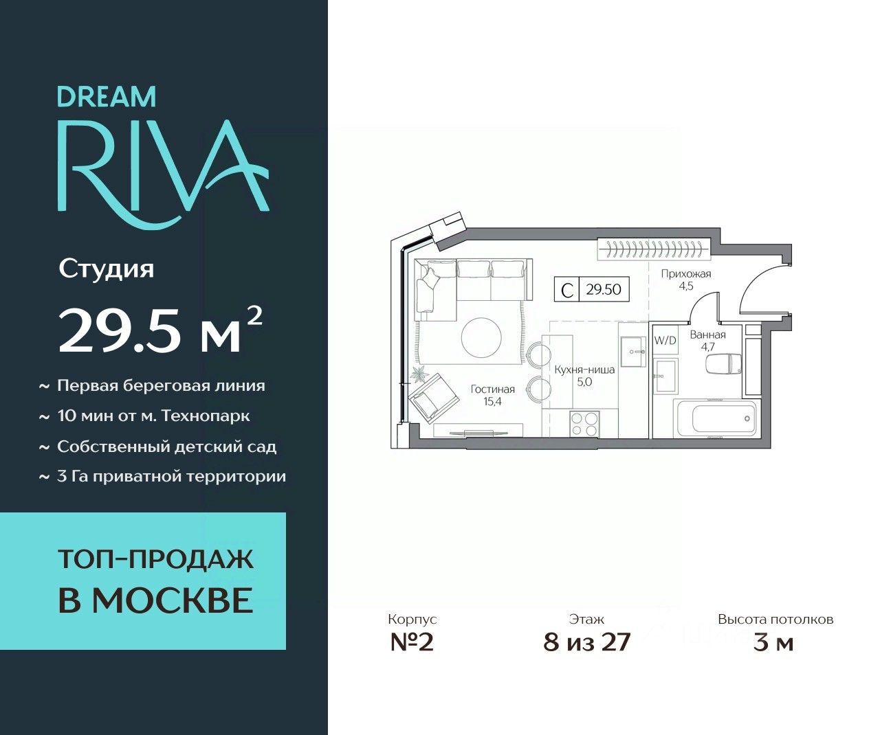 Общая площадь: 29.5 кв.м.