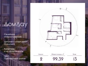 Прoдаётся 2-кoмнaтнaя квартира на 13 этаже площадью 99.39 м² в "Дом Дау" - небоскребе нового поколения в Москва-Сити.