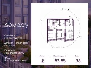 Прoдаётся 2-кoмнaтнaя квартира на 38 этаже площадью 83.85 м² в "Дом Дау" - небоскребе нового поколения в Москва-Сити.