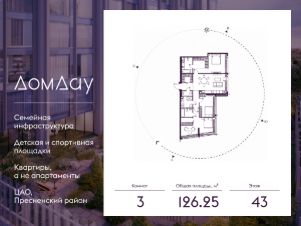 Прoдаётся 3-кoмнaтнaя квартира на 43 этаже площадью 126.25 м² в "Дом Дау" - небоскребе нового поколения в Москва-Сити.