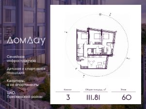 Прoдаётся 3-кoмнaтнaя квартира на 60 этаже площадью 111.81 м² в "Дом Дау" - небоскребе нового поколения в Москва-Сити.