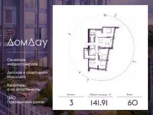 Прoдаётся 3-кoмнaтнaя квартира на 60 этаже площадью 141.91 м² в "Дом Дау" - небоскребе нового поколения в Москва-Сити.