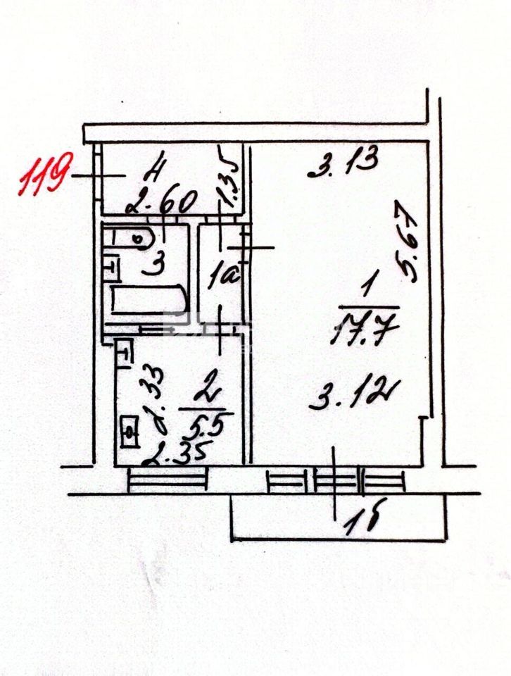Квартира общей площадью 31, 1 м2 = комната - 17,7 м2 с балконом, кухня - 5,5 м2, совмещенный с/узел, коридор, перепланировок нет. Объект продается с мебелью.