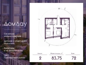 Прoдаётся 2-кoмнaтнaя квартира на 72 этаже площадью 83.75 м² в "Дом Дау" - небоскребе нового поколения в Москва-Сити.