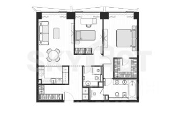 Планировка: кухня-гостиная, спальня с ванной комнатой и гардеробной, спальня, санузел, гардеробная.