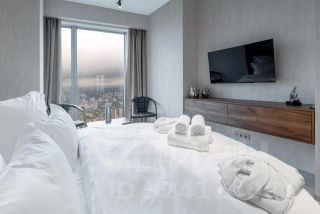 Апартаменты-студия с дорогим дизайнерским ремонтом расположены в жилой башне ОКО в деловом квартале Москва-Сити.