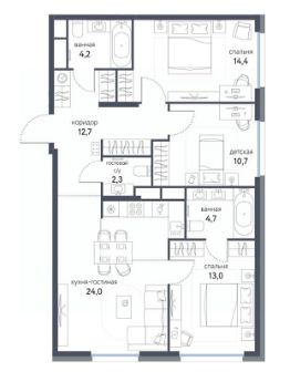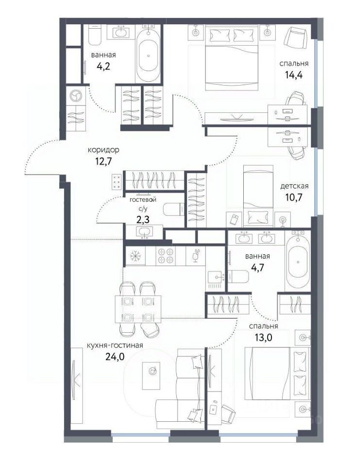 Отличная планировка для комфортной семейной жизни-кухня 24кв.м; большой коридор 12.7кв.м; три санузла и три уютные спальни, включая мастер-блок.
