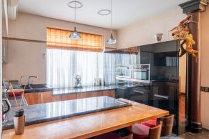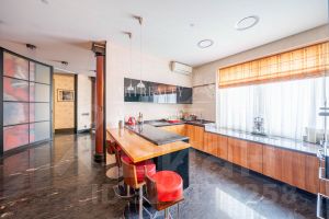 Кухня полностью оснащена встроенной техникой Kuppersbusch включая винный шкаф и мастер шеф, на стенах венецианская штукатурка и камень травертин.