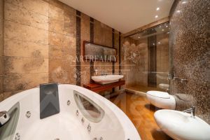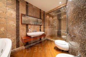 В ванной на стенах итальянский мрамор травертин ручной работы, мозайка с добавлением платины, на полу специально высушенный паркет влагостойкий, сантехника и мебель Villeroy & Boch.