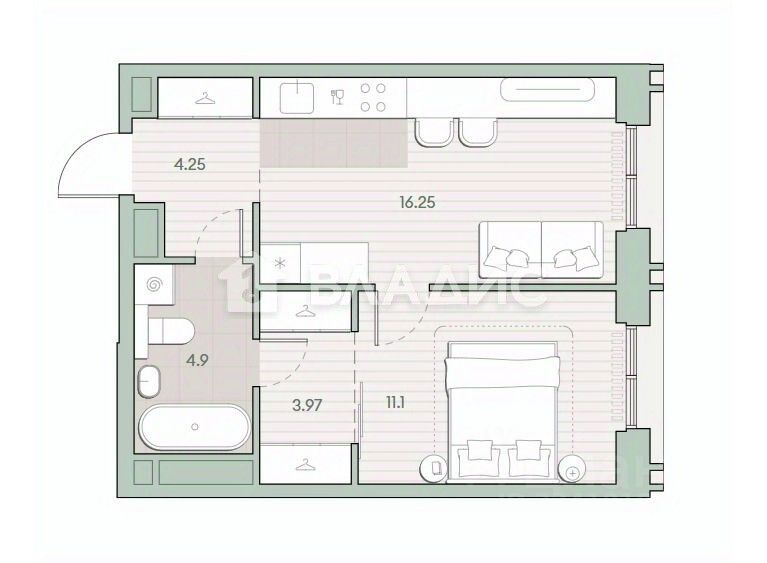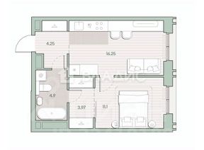 Квартира - отделка WHITE BOX. Широкоформатные панорамные окна в пол. Эргономичная планировка. Кухня - гостиная - 16.25 кв.м Спальня - 11.1 кв.м Гардеробная - 3,97 кв.м Холл - 4,25 кв.м Санузел - 4,9 кв.м.